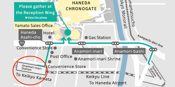 For all participants, please meet us at "Anamori-inari Station" at 09:10 presented on a RED CIRCLE on the map above.